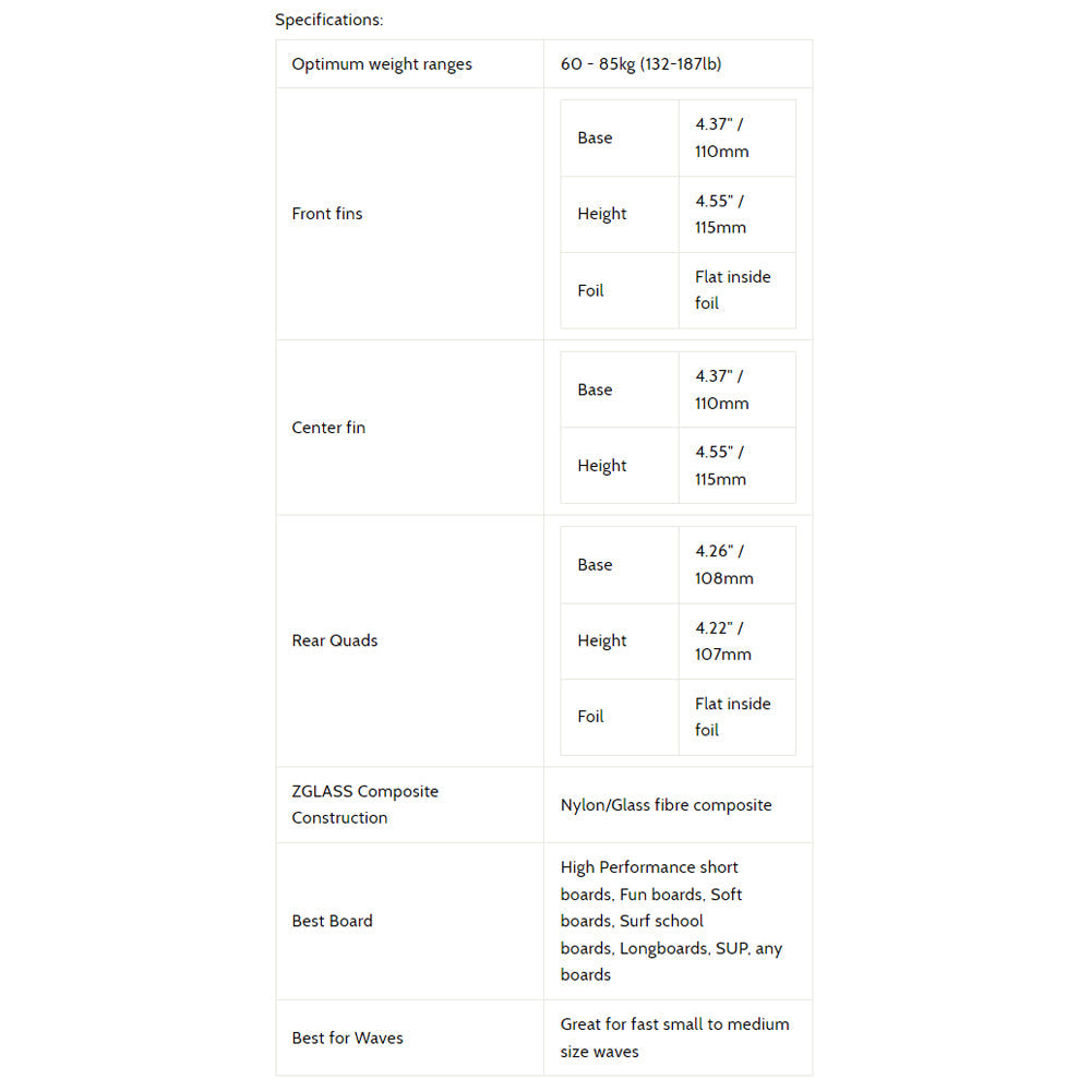 A lot of the boards today give you the option of a Thruster or Quad set up. So why buy 2 different sets? A great all-rounder template that can be ridden as a Thruster or a Quad. Either set up can be pushed hard through tight turns or drawn out carves.