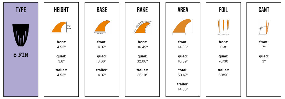 The rear quads have a 60/40 foil to them that offer better hold in all kinds of surf while the fronts were kept a bit smaller, so they are not too stiff or too loose. Chris designed this template for waist-high to double-overhead waves. Very balanced.
