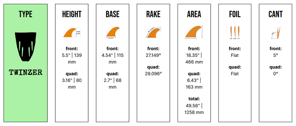 This set has a rear fin that is more upright for pivot while the front fins get right on the rail for more bite and speed. The Twinzer will generate more "squirt" and allow for tighter turns in the pocket compared to traditional twin fin setups.