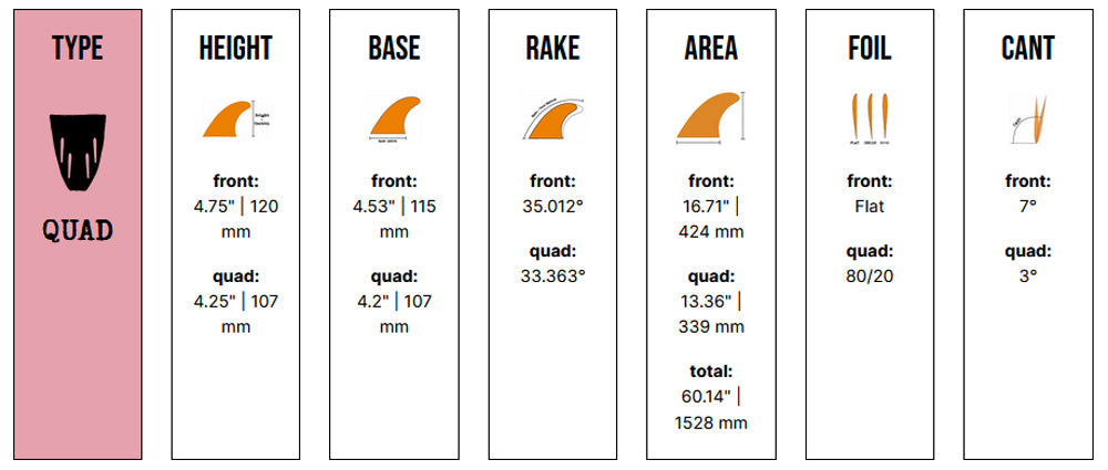 The Josh Hall Quad is a performance set made for boards 8 feet and under. It's an upright fin with a 4 ¾ front and 4 1/8 back and works well with everything performance quads to hybrid designs like Josh's Fish Simmons Quad. "Slide the Glide" - Josh Hall